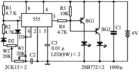 用555 時基電路可組成各種形式的自激式多諧振蕩器。大功率LED 頻閃光源,主要由1 個555 多諧振蕩器構成的信號發生器、1 個功率放大器和2 個LED 組成。信號發生器的作用是產生所需要的工作頻率脈衝,並且振蕩頻率可以根據需要調整。功率放大器將脈衝信號放大後,驅動大功率LED 發光。改變信號發生器的振蕩頻率,可使光源的頻閃時間間隔隨之變化;過增、減LED 個數或更換不同功率的LED ,可以改變光源的總亮度。如圖3 所示,電路中的555 多諧振蕩器電路,既可以調節振蕩頻率,又可以調整振蕩脈衝的占空比。信號發生器的振蕩頻率就是LED 閃光的頻率,可以根據拍攝對象調整。而振蕩脈衝的占空比,決定了LED 每次頻閃的延續時間。