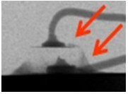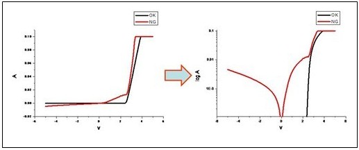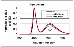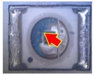 2. 變色:這類失效是指LED不(bu)點(dian)亮(liang)的(de)狀(zhuang)況(kuang)下(xia),外(wai)觀(guan)顏(yan)色(se)或(huo)膠(jiao)材(cai)透(tou)明(ming)度(du)與(yu)新(xin)品(pin)不(bu)同(tong),用(yong)肉(rou)眼(yan)即(ji)可(ke)看(kan)出(chu),通(tong)常(chang)在(zai)產(chan)品(pin)使(shi)用(yong)一(yi)段(duan)時(shi)間(jian)或(huo)在(zai)做(zuo)完(wan)可(ke)靠(kao)度(du)試(shi)驗(yan)後(hou)發(fa)生(sheng)。一(yi)般(ban)說(shuo)來(lai),變(bian)色(se)區(qu)域(yu)大(da)致(zhi)可(ke)區(qu)分(fen)為(wei)發(fa)生(sheng)在(zai)導(dao)線(xian)架(jia)或(huo)封(feng)裝(zhuang)膠(jiao)材(cai)兩(liang)類(lei),若(ruo)發(fa)生(sheng)在(zai)導(dao)線(xian)架(jia),通(tong)常(chang)是(shi)因(yin)為(wei)表(biao)麵(mian)與(yu)環(huan)境(jing)中(zhong)的(de)化(hua)學(xue)物(wu)質(zhi)發(fa)生(sheng)反(fan)應(ying),如(ru)氧(yang)化(hua)或(huo)硫(liu)化(hua),要(yao)分(fen)辨(bian)屬(shu)於(yu)哪(na)種(zhong)需(xu)仰(yang)賴(lai)成(cheng)份(fen)分(fen)析(xi),可(ke)使(shi)用(yong)的(de)儀(yi)器(qi)包(bao)含(han)有(you)EDS(Energy Dispersive X-ray Spectroscope)、XPS(X-ray Photoelectron Spectrometer)、AES(Augur Electron Spectroscope)等等。若是封裝用的膠材發生變色,則屬於高分子材料的劣化現象,如環氧樹脂易受高溫或是紫外光影響而變黃,因此白光LEDduogaicaixijiaoqudaizhi。fenxicileishixiaoyingtebieliuyi,yinjiaocaibenshenyouyidingdetoumingdu,youshibiansededaoxianjiayinbeijiaocaigaizhuerwupanweijiaocaibianse,yindaozhicuowudegaishanfangxiang。