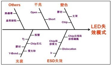 5. 其他:突然間的失效常常是因為熱應力所致,當環氧樹脂的封裝達到玻璃轉移溫度(Tg)時,樹脂會很快速的膨脹,在半導體和焊點接觸的位置產生機械應力來弱化或扯斷它,而在非常低的溫度時則會讓封裝產生裂痕。 此外,高功率LED對電流的擁擠敏感,不均勻的電流密度分布在接合點(junction)shang,kenenghuichanshengjubuderedian,cunzaireshaohuidefengxian,ruozaichuxianjibanderechuanbujunyun,jiangshiwentibiandegengyanzhong,zhechangjianyu銲jiecailiaodekongdonghuoshidianziqianyixiaoyingheKirkendall空洞,故熱燒毀亦是LED常見的失效模式。