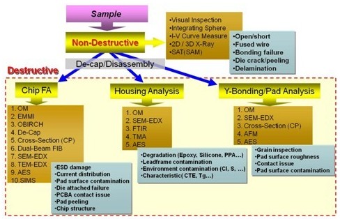 從上可知,一個LED產品的失效,起因可能來自於該產品的任何一個部份,故必須抽絲剝繭方能找到真正的失效原因。針對失效來自LED燈粒而言,因完整的LED燈粒中,LED chip本身很強壯,但包複chip的封裝材料則易遭受損傷,因此,LED燈粒的失效多可歸因於封裝材料的破壞或劣化所導致。若要充分解析這類失效,牽涉到光學、化學、材料學、電子物理學等領域的專業知識,並搭配精密的儀器與豐富的實務經驗,才能確認失效點並推導真因,進而提出改善對策。
