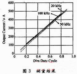 圖4為在PWM調光模式下外加PWM脈衝驅動信號和輸出驅動電流的測量結果。PWM占空比從0~100%。從圖中可以清楚的看到,通過改變不同的PWM占空比可以調節額定電流,PT4115最大能夠輸出1.2 A的電流。