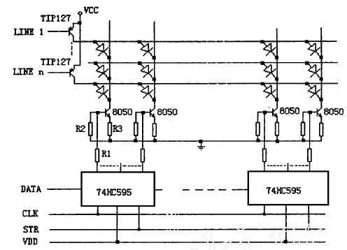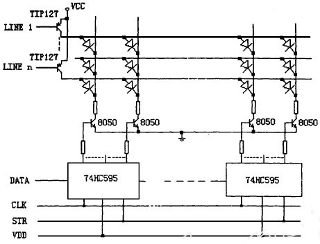 常規型驅動電路的設計一般是用串入並出的通用集成電路芯片如74HC595或MC14094 等作為列數據鎖存,以8050 等小功率NPN 三極管為列驅動,而以達林頓三極管TIP127等作為行掃描管,其電路如圖1 所示。