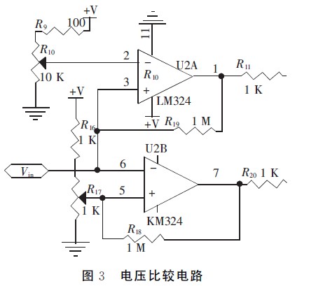 放大後的電壓Vin分別輸入單片機A/D通道和由LM324組(zu)成(cheng)的(de)上(shang)下(xia)限(xian)電(dian)壓(ya)比(bi)較(jiao)器(qi),根(gen)據(ju)比(bi)較(jiao)器(qi)輸(shu)出(chu)分(fen)析(xi)信(xin)號(hao)幅(fu)度(du)是(shi)否(fou)在(zai)規(gui)定(ding)範(fan)圍(wei)內(nei)。為(wei)了(le)使(shi)電(dian)路(lu)工(gong)作(zuo)更(geng)穩(wen)定(ding),比(bi)較(jiao)電(dian)壓(ya)值(zhi)需(xu)預(yu)留(liu)一(yi)定(ding)的(de)豁(huo)量(liang)。如(ru)圖(tu)3所示,調節R10使比較上限電壓為2.3V,調節R17使比較下限電壓為0.1V,當Vin在0.1~2.3V時,量程合適,比較器輸出邏輯電平00,啟動A/D轉換電路。否則,當Vin>2.3V時,通過模擬開關MAX312並配合軟件來切換I/V轉換電路的反饋電阻,向大量程切換;當Vin<0.1V時,向小量程切換,以適應不同強度的光信號。