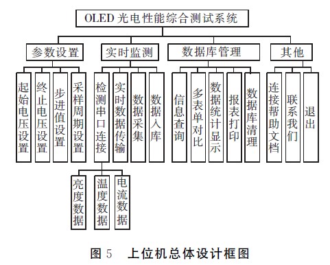 係統是集電壓、電流、亮度和溫度的自動采集、預處理、數據存儲為一體的綜合信息平台。使用RS-232通信實現程控電源、下位機和計算機的通信,實時獲取亮度、溫度、電流數據,把當前電壓下對應的亮度、溫度和電流值存入數據庫中,並繪製出實時曲線。在曆史數據查詢中,可以對不同結構的OLED器件的測量結果進行對比分析。