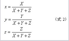 CIE XYZ 1931色度係統中的色坐標x, y, z與三刺激值XYZ之間的關係式如下: