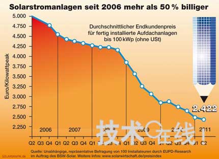 德國太陽能發電行業團體BSW-Solar宣布,屋頂設置型太陽能發電係統2011年第一季度的零售價(包含安裝工程費)降到了2006年的一半以下。