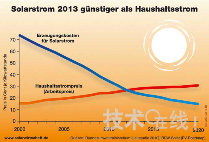 BSW-Solar預測,到2012年德國太陽能發電成本將與家庭電費持平,到2013年太陽能發電成本將更低(圖2)。並且,預計到2017年,即使沒有固定價格收購製度等,太陽能發電係統的發電成本也比傳統發電係統有競爭力。