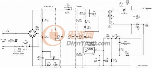 本電路為非隔離式、非連續導通模式反激轉換器電路,以350 mA的輸出電流為電壓為12V到18 V的LED燈串提供驅動。驅動器完全能夠在寬輸入電壓範圍內工作,並提供高功率因數。本電路可同時滿足輸入浪湧和EMI要求,其元件數較少,能夠使電路板尺寸滿足LED燈泡替換應用的要求。