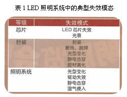 LED模組和燈具的典型失效模式包含了不同層次的失效模式,涉及到LED封裝結構以及工藝過程(如表1)。LED在實際使用中,由於複雜的環境以及封裝工藝局限性從而使封裝材料退化、熒光粉退化、金屬電遷移、局部溫度過高產生的熱應力所引起的芯片和矽膠的分層或金線斷裂等等,從而影響LED發光甚至導致整個LED的失效。而且LED產生的高溫會導致芯片的發光效率降低,光衰加快、色移等嚴重後果。