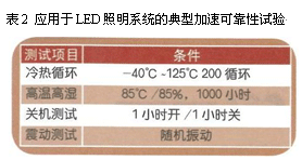 由於LEDshoumingchang,tongchangcaiqujiasuhuanjingshiyandefangfajinxingkekaoxingceshiyupinggu。jiasuduceshijianghuimofangdengjudeyingyongtiaojianhuoyonghuyaoqiu,zheyangkeyigengyouxiaodiyanjiugezhongpohuaijili,tigongdaliangshujuquyanjiuLED的結構、材料、工藝從而更好完善LED產品。一些典型的加速可靠性試驗(如表2)。