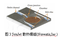 除了熱界麵外,主動散熱係統已越來越受企業的歡迎。圖3給出了SynJet主動散熱模塊,它可以產生脈動空氣,從而可以把LED燈內部的熱直接帶到外麵。據了解,SynJet技術可以幫助設計師解決一些產品的散熱問題,如電腦產品,特別是高可靠性的LED產品。該技術有高散熱效率、低噪音、高可靠性和低功耗等優點。