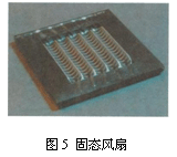 圖5顯示了一種固態風扇,這是Dan Schlitz和Vishal Singhal經過六年的不斷積累所發明的成果。他們曾經是美國普渡大學研究人員,現在就職於Thorrn微(wei)技(ji)術(shu)公(gong)司(si)。該(gai)研(yan)究(jiu)表(biao)明(ming)它(ta)具(ju)有(you)超(chao)薄(bo)風(feng)扇(shan)的(de)功(gong)能(neng)但(dan)沒(mei)有(you)任(ren)何(he)運(yun)動(dong)部(bu)件(jian)。其(qi)原(yuan)理(li)是(shi)在(zai)空(kong)氣(qi)中(zhong)微(wei)電(dian)極(ji)靠(kao)的(de)很(hen)近(jin)的(de)時(shi)候(hou),空(kong)氣(qi)被(bei)電(dian)離(li),由(you)於(yu)這(zhe)些(xie)離(li)子(zi)的(de)運(yun)動(dong)而(er)產(chan)生(sheng)動(dong)能(neng),從(cong)而(er)推(tui)動(dong)空(kong)氣(qi)產(chan)生(sheng)吹(chui)風(feng)效(xiao)果(guo)。他(ta)們(men)還(hai)提(ti)到(dao),希(xi)望(wang)將(jiang)來(lai)該(gai)技(ji)術(shu)在(zai)成(cheng)本(ben)上(shang)可(ke)以(yi)接(jie)近(jin)傳(chuan)統(tong)的(de)冷(leng)卻(que)係(xi)統(tong)。