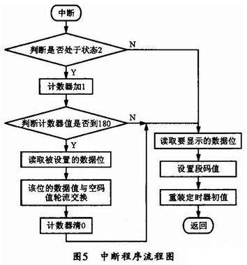 在狀態2下,參數設定時,設定位要實現閃爍,以確定正在被設置的數據位。實現閃爍的基本思想是每隔500 ms,當前閃爍數據位的段碼值就由數據狀態變為空碼狀態,下一個500 ms再由空碼狀態變為數據狀態,並不斷循環執行此操作(共陽極顯示方式下空碼值為0XFF)。這樣,從用戶角度看,當前被設定的數據位就是閃爍的。這裏可通過設定一個計數器來確定轉換時間,當計數值達到500/2.78(約為180)時,當前閃爍數據位就進行段碼值轉換。本係統的中斷程序流程圖如圖5所示。