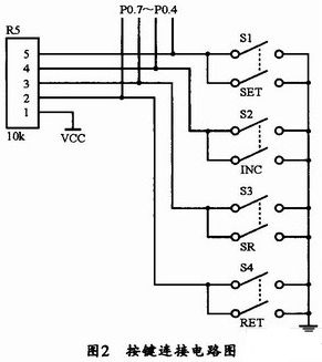 圖2中,單片機P0口的P0.4、P0.5、P0.6、P0.7分別與按鍵1、2、3、4相xiang連lian,以yi對dui按an鍵jian操cao作zuo進jin行xing控kong製zhi。在zai按an鍵jian處chu理li時shi,通tong常chang要yao考kao慮lv按an鍵jian去qu抖dou問wen題ti,經jing常chang使shi用yong的de硬ying件jian去qu抖dou方fang法fa有you濾lv波bo消xiao抖dou電dian路lu和he雙shuang穩wen態tai消xiao抖dou電dian路lu,也ye可ke以yi采cai用yong軟ruan件jian去qu抖dou。本ben文wen在zai設she計ji時shi,考kao慮lv到daoLED顯示麵板大小的限製,故采用軟件去抖方法。