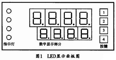 本文的LED通用智能型顯示麵板如圖1所示。該麵板中央為兩排LED數碼管,每排4位。上排為紅色,下排為綠色。麵板左邊為四個發光二極管,右邊為四個按鍵開關。其顯示和開關可根據不同應用定義。