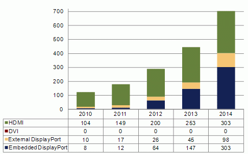 - 移動電腦搭載Embedded DisplayPort界麵的比率將在2013年達到35%。