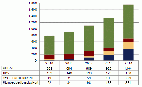 另外在PC/Display Interface By Device, Q4’11 Forecast (電腦與顯示器接口統計數據庫與預測) 報告中,In-Stat 針對所有搭載各種接口(Embedded DisplayPort, External DisplayPort, DVI, HDMI)的數字電子裝置進行統計與預測。2011年在所有搭載數字界麵的電子裝置中,搭載HDMI的數量達到了9億零6百萬單位,預計2014年將成長到17億單位以上。這其中包含了智能手機、移動電腦、投影機、電腦顯示器、周邊裝置、數碼相機、攝像機、MP3、遊戲機、機頂盒、藍光播放器、數字電視、商用顯示器等手持式消費性電子產品和固定式消費性電子產品。