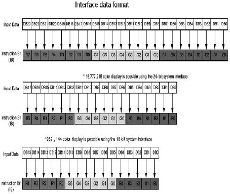 圖4 顯示了圖片的數據是怎樣實現灰階的。第一個是典型的24bit 顯示接口,數據通過GRAM 後轉換成8bit Red、8bit Green 和8bit Blue.同理,18bit 的顯示接口將數據轉換成RGB 666,16bit 的顯示接口將數據轉換成RGB 565,繼而混色成0到255 灰階的不同色彩。
