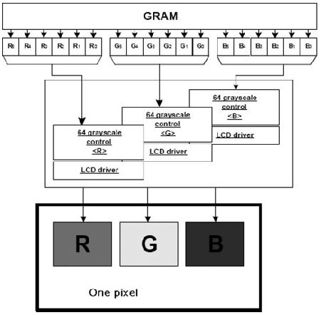 通tong過guo嚴yan格ge控kong製zhi和he改gai變bian液ye晶jing上shang所suo施shi加jia的de電dian壓ya,每mei種zhong子zi像xiang素su呈cheng現xian不bu同tong的de灰hui階jie。在zai結jie合he了le這zhe三san種zhong子zi像xiang素su後hou,可ke以yi得de到dao一yi個ge可ke以yi顯xian示shi不bu同tong顏yan色se的de顯xian示shi屏ping。
