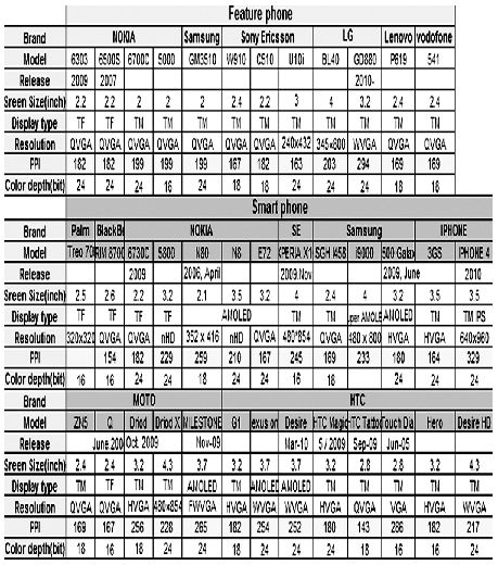 市麵上所說的1,600 萬色即24 位(bit),26 萬色即18 位(bit),而65K 色也就是16 位(bit)。;圖1中顯示了市麵上部分手機的顏色,可以看到,目前大多數手機廠商特別是手機大廠會選擇24bit,也即1,600 萬顏色。