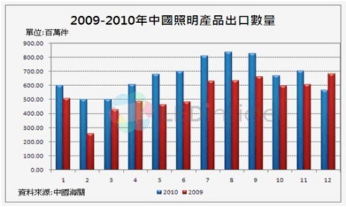 集邦科技旗下研究部門 LEDinside 研究指出,中國目前已成為照明燈具產品的製造大國,將近70%的照明產品都是由中國地區所生產,以白熾燈來說更是如此。LEDinside調查指出,2010年白熾燈、鹵鎢燈、(緊湊型熱陰極)螢光燈與其他燈具的每月平均出口數量達6.67億件,金額達11.40億美元;總計2010年出口數量達79.9億件且金額達136.77億美元,相較於2009年,數量成長24.2%,且金額成長34.7%。