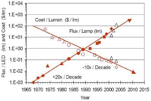 依據過去30年LED發展觀察,Lumileds Lighting公司的Roland Haitz先生於2003年歸納出LED界的Moore(摩爾)定律—Haitz定律(如圖1所示),說明LED約每18~24個月可提升一倍的亮度,以此定理推估10年內LED亮度可以再提升20倍,而成本將可降90%以達到可完全取代現有照明技術,因此LED照明於近幾年火熱的被重視與探討。