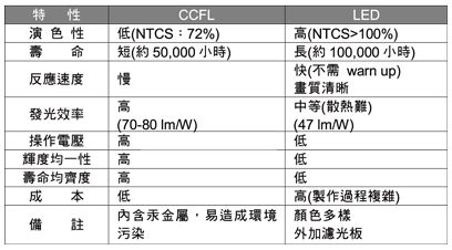 LED因耗電低、不含汞、壽命長、體積小、降低二氧化碳排放量等優勢吸引國內、外廠商極力推廣取代現有照明。 LED主要照明可分為顯示背光、車用照明、交通號誌與室內室外照明,而背光模組於2009年被廣泛的應用於筆記型電腦麵板上,此後亦逐漸被使用到家用電視機,其約占了50%之麵板模組零組件製造成本與消耗約70%顯示器之電能,故背光照明為顯示麵板最重要的關鍵。 然液晶顯示器無法自行發光,因此需要背光模組作為光線的來源,所以背光源的好壞會影響顯示的效果甚劇。 加上麵板需薄型化的因素,因此多以CCFL燈管作為背光源,而LED背光源比起CCFL有演色性佳、壽命長、反應速度快等優勢(如表1)。
