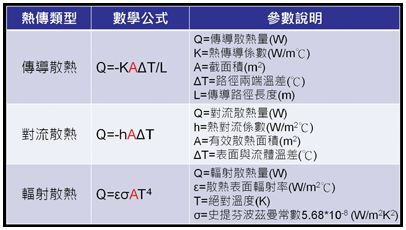 在了解散熱之前還要知道熱歐姆定理,傳統的電流歐姆定理:V=IR,壓降=電流×電阻,電阻愈大,壓降就愈大,表示電壓在元件中消耗量愈大;同樣的,熱歐姆定理:ΔT=QR,溫差=熱流×熱阻,當熱阻愈大時,就有愈多的熱殘留在元件內,這說明了散熱效果要越好,熱阻就要越低。 熱歐姆定理是以熱阻(Thermal resistance)將熱傳以物理量量化,計算方式為LED介麵溫度與室溫的溫差除以單位輸入功率。 簡單來說,如熱阻為10℃/W,表示每輸入1W的能量會是LED上升10℃。