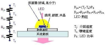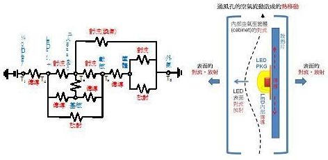圖2為LEDyuanjianchuizhirezutu,reyuanyoujiemianchanshengzaichuizhixiangshangxiachuandi,yinbaohucengfengzhuangcaiyongdirechuanxishucailiao,jiashangmianjiyouxiao,suoyijinyoujishaoliangrenengxiangshangchuandierbeihulvejisuan,suoyichuandizongrezu=介麵到黏接點熱阻+黏接點到基板熱阻+基板到載板熱阻+載板到空氣熱阻,熱會由介麵迅速傳遞到大麵積之載板或散熱片,再經由水平傳遞到大麵積的表麵上與空氣熱交換對流完成散熱。