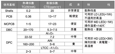以下將LED散熱封裝材料之比較列於表3,早期LED以yi炮pao彈dan型xing方fang式shi進jin行xing封feng裝zhuang,其qi散san熱re路lu徑jing中zhong有you一yi小xiao部bu分fen熱re源yuan經jing保bao護hu層ceng往wang大da氣qi方fang向xiang散san熱re,大da多duo熱re源yuan僅jin能neng透tou過guo金jin屬shu架jia往wang基ji板ban散san熱re,此ci封feng裝zhuang熱re阻zu相xiang當dang地di大da,達da250~350℃/W。 進而由表麵貼合方式(SMD)於PCB基板上封裝,主要是藉由與基板貼合一起的FR4載板來導熱,利用增加散熱麵積的方式來大幅降低其熱阻值。 但此低成本的封裝要麵臨的問題是,FR4本身熱傳導係數較低,膨脹係數過高,且為不耐高溫的材料,在高功率的LED封裝材料上不太適用。