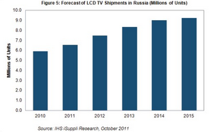據IHS iSuppli公司的電視研究報告,隨著青睞先進電視技術的中產階級不斷壯大,今年俄羅斯液晶電視出貨量預計強勁增長10%。俄羅斯屬於所謂的金磚國家(BRIC),是一個重要市場。