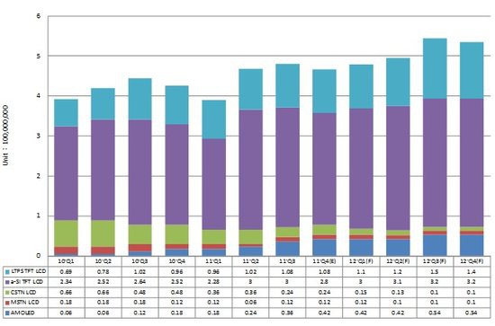 2012年全球手機與平板電腦之中小尺寸麵板出貨量預估