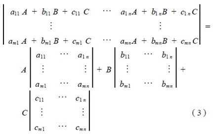 矩陣(2) 中的每一元素代表著M ×N 點CRT圖像中對應像素點的圖像亮度信息,而元素在矩陣中的位置恰恰是該像素點在CRT 圖像中的位置。其中A 、B 、C 代表著具有單位亮度的R、G、B 三原色,係數aij 、bij 、cij 為零和正整數,它決定著混成該像素點顏色所需R、G、B 三色的亮度份額,如果將該圖像白電平亮度所含R、G、B 三原色的亮度分別等分成N 級,那麼每份亮度就是A 、B 、C , 即單位亮度, aij 、bij 、cij 的取值分別為從0 到N ,表示用aij 份的單元亮度紅色, bij 份的單位亮度綠色和cij 份的單位亮度藍色,可混成該元素所對應像素點的顏色。根據矩陣運算法則,矩陣(2) 又可表示為