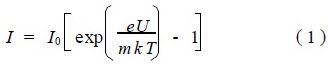式中m 為複合因子, I0為反向飽和電流, UT =kT/e 稱為溫度電壓當量,在熱力學溫度T = 300 K時,UT = 26 mV1 在寬禁帶半導體中, 當I <0. 1 mA時,通過結內深能級進行複合的空間複合電流起支配作用,這時m = 2 ;電流增大後擴散電流占優勢時m = 1.U 為外加電壓。