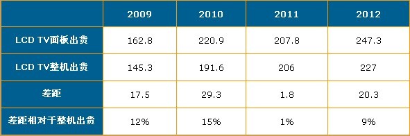- 2010年電視麵板出貨與整機出貨差距達到了15%