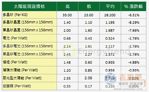而在電池方麵,最低價格仍來到每瓦0.43美元,平均價格則滑落到每瓦0.524美元,跌幅為2.78%;另外在模組方麵,雖然矽晶太陽能模組的平均價格持續下滑到每瓦0.935美元,跌幅為4.88%;而薄膜部分也是下滑的狀況,平均價格來到0.856美元,跌幅為0.93%。