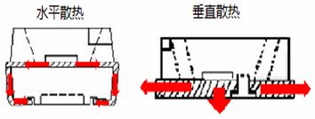 圖1和圖2分別為垂直散熱與水平散熱LED的結構示意圖,圖3所示為兩種LED的散熱方式示意圖。