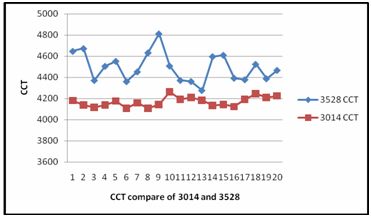 隨機選取3014LED和3528LED各20個,其光通量和色溫如圖9、圖10所示,橫坐標表示LED個數,縱坐標表示光通量和相關色溫CCT。