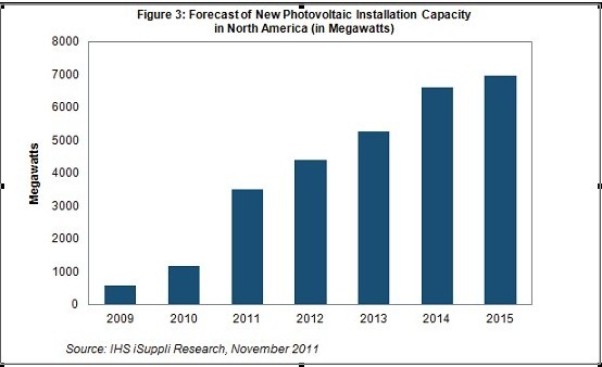據IHS iSuppli公司的北美光伏市場報告,美國加州的許多太陽能項目經過多年開發之後終於投產,預計2011年北美的光伏(PV)太陽能係統安裝容量將大增200%。
