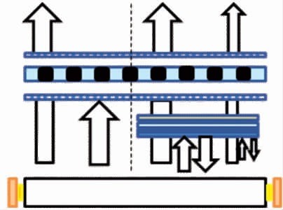 為了使用盡可能少的LED而又保持良好的光學特性,本文設計的LED背光選用了1層擴散膜、2層棱鏡膜和1層雙層增亮膜(DBEF),膜材參數如表1所示。擴散膜可以改變LGP出射的光路,讓射出的光更加均勻;還可以隱藏LGP 上的dot,使(shi)從(cong)正(zheng)麵(mian)看(kan)不(bu)到(dao)散(san)射(she)點(dian)的(de)影(ying)子(zi),擴(kuo)大(da)視(shi)野(ye)角(jiao),提(ti)升(sheng)輝(hui)度(du)。棱(leng)鏡(jing)膜(mo)即(ji)增(zeng)亮(liang)片(pian),主(zhu)要(yao)利(li)用(yong)全(quan)反(fan)射(she)和(he)折(zhe)射(she)定(ding)律(lv),將(jiang)分(fen)散(san)的(de)光(guang)集(ji)中(zhong)於(yu)一(yi)定(ding)角(jiao)度(du)範(fan)圍(wei)內(nei)出(chu)射(she),從(cong)而(er)提(ti)高(gao)該(gai)範(fan)圍(wei)內(nei)的(de)亮(liang)度(du)。DBEF 是本文LED背光模組的關鍵膜材,可以使整個模組的亮度提升一倍,其工作原理如圖2所示。DBEF可以將不能通過下偏光片的光線反射回背光,經背光的二次反射,部分光線又可以通過DBEF和下偏光片出射。經過多次回收和利用,光的透過率得以大幅提高。