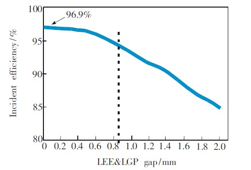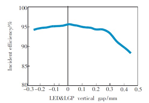 LED發光麵和LGP入光麵兩者之間的垂直距離通常會被忽略,但如果兩者之間的距離過大,也會嚴重影響入射效率。通過試驗發現,兩者之間的距離在±0.2mm範圍內時,入射效率變化緩慢,且保持在95%左右,所以控製LED發光麵和LGP入光麵的垂直距離在±0.2mm範圍內即可。