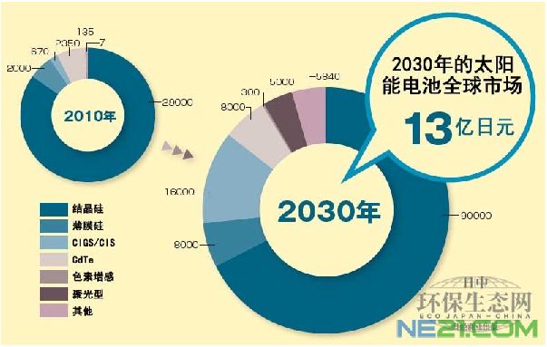 以由銅、銦、镓、硒構成的化合物為原料,被稱為CIGS或CIS的太陽能電池預計將出現迅速增長。2010年為670億日元,到2030年將擴大到1.6萬億日元,約為2010年的24倍。