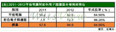 整體而言, WitsView 認為 2012年平板電腦的發展基調將偏向樂觀,預估平板電腦本身的需求達8,260萬台,彩色電子閱讀器方麵則為1,230萬台,兩者合計的市場規模將從今年的5,760萬台攀升至9,490萬台,年成長率高達65%。