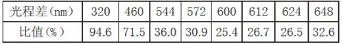 由圖1 可總結出,在有效光程差較小時,可見光的各波長比較聚集,顏色隻有黑白兩色。在有效光程差300nm 附近出現一亮態極大值,之後隨著有效光程差的增大,不同波長的相位差差別越大,其亮態峰值將越來越小。