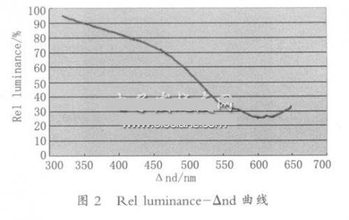 采用本試驗總結出的以上Rel luminance- Δnd曲線,對於某一未知光程差的VA 液晶顯示器,隻需簡單測試出高壓光電曲線,得出高壓顯示亮度與最大值顯示亮度的比值,然後對照圖2 所示的曲線,就可準確得出相應的光程差值。