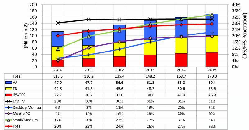 圖1:分模式的TFT液晶麵板市場(按麵積計算)和IPS/FFS普及率