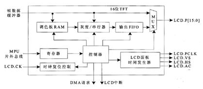 LCD控製模塊的數據通道由調色板RAM、灰度/串行器和輸出FIFO這3個部分組成。這3個部分支持12或16位STN方式,由控製器控製輸出數據到LCD的數據總線上。而對於16位薄膜工藝學(TFT,Thin ̄Film Technology)方式,數據直接傳輸到LCD的總線,提供2(16)=64K的彩色信號。