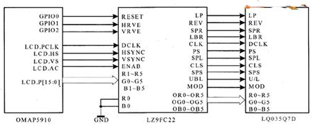 LCD驅動電路和0MAP5910的迕接如圖2所示。使用OMAP5910的LCD控製器接口連接LZ9FC22。LZ9FC22是Sharp公司專門配合LQ035Q7D型號LCD的驅動芯片,可以和LQ035Q7D進行無縫連接。