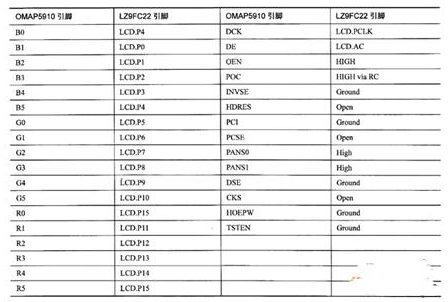 LZ9FC22和OMAP5910的LCD控製器連接,由於LZ9FC22是18位控製器(RGB信號各有6位),而OMAP5910的LCD控製器的輸出隻有16位數據,為此必須損失兩位數據,將LZ9FC22的R0和BO接地,或者將R0和R5、BO和B5連接在一起。
