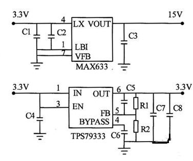 LQ035Q7D麵板顯示需要15V的高壓,而LQ035Q7D的邏輯電平需要3.3V電源。圖3實現從3.3V轉換到15V和3.3V的電源原理。其中3.3V到3.3V使用TI公司的TPS79333,是為了保證輸出到LCD的3.3V穩定可靠,如果TPS79333的輸入3.3V足夠穩定,滿足LQ035Q7D的要求,也可以直接將該電源連接到LCD。